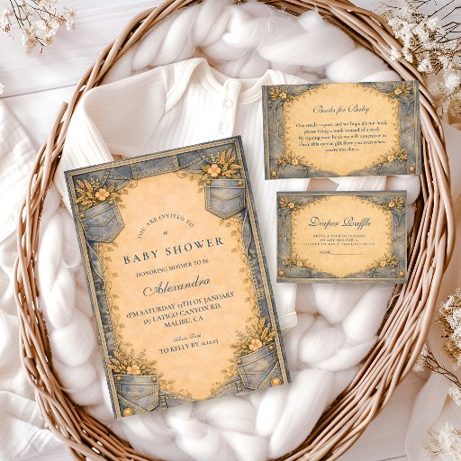 Celebrate a little one on the way with this Blue Jeans baby shower invitation, inspired by classic denim details and rustic charm. Featuring a warm parchment-style center framed by illustrated blue jean textures, stitched seams, and soft neutral florals, this design feels cozy, timeless, and effortlessly charming. Perfect for a casual country-inspired baby shower, a western-themed celebration, or anyone who loves a relaxed, all-American denim look. Easily personalize with your event details for a memorable and stylish baby shower invitation.