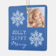 Blue Jolly Merry Snowflake Photo Christmas Holiday Ornament. Pretty white snowflake on a blue background. Merry, Happy, Jolly text in a festive typography. The design has a custom photo - insert your favourite photo into the template and make your personal unique Christmas ornament.