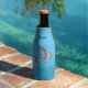 Blue kite surfing themed bottle cooler with customisable text. Colourful kites fly over the ocean on a summer day.
