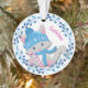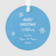 A cute little grey kitten sits inside a sky blue Holiday wreath on the front of this ornament. The kitten wears a blue stocking cap with white snowflakes and winter scarf. She holds a pink and white striped candy cane. Your child's name is in pink at the upper right. The back of the ornament is solid matching blue, with scattered white snowflakes and your custom text in five fields. Easy to customise, and any little girl would love this keepsake ornament from a parent or grandparent.