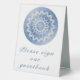 Add a graceful reminder to your reception décor with this Blue Lace Mandala Wedding Table Tent Sign, designed to blend beauty with purpose. Featuring a delicate mandala with an intricate lace pattern and refined geometric design, this sign displays the message please sign our guestbook in elegant script. The simple layout and feminine design make it easy to read while enhancing your wedding decor. Perfect for wedding receptions, this table tent sign guides guests effortlessly while adding a cohesive, polished touch to your tables. Ideal for couples who appreciate timeless details, the blue mandala design elevates your guestbook table with subtle elegance.