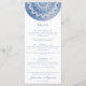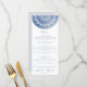 Enhance your reception tables with this Blue Lace Mandala Wedding Menu, designed to add a graceful finishing touch to your reception dinner décor. Featuring a delicate mandala with a refined lace design and balanced geometric pattern, this menu blends elegant script with clean modern typography for a feminine theme that feels timeless and sophisticated. The simple layout keeps your menu easy to read while elevating the overall look of your wedding receptions. Personalization is effortless with fully editable text—customize your reception dinner courses and wording to match your celebration, then view your personalized design before purchase to ensure every detail looks perfect. Ideal for coordinating with your wedding stationery, this Blue Lace Mandala menu creates a polished and cohesive table setting your guests will love.