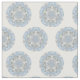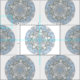 This fabric has a lacy blue abstract design circle in a repeating print that is non-directional. The abstract resembles a snow flake. Light blue with blueish grey accents.