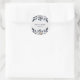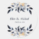 Blue Leaves with Gold Wedding Classic Round Sticker designed with delicate, soft leaves in shades of Dark Navy, and Light Blue, accented with Gold coloured highlights. The text includes: the Bride and Groom's First Names and Wedding Date. To personalise, simply insert your details into our easy template, replacing the sample text. Be sure to view the entire Blue Leaves with Gold Wedding Collection for matching pieces.