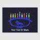 A blue, lion-themed Chanukkah menorah with lit candles superimposed on a starry background. Add your own text.