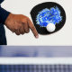 traditional watercolor artwork of a male lion in surreal blue colours on a ping pong paddle