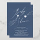 SilverFoil baby shower invitation featuring a modern script set on a blue background.