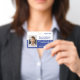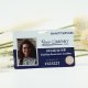 Bright blue and white facility entry badge with a bar code on back is ideal for department specific clearance. Easily upload multiple logos and an employee photo. This can hang on a matching lanyard that also holds a company key card. This company badge is versatile for royal blue, navy blue, or blue and grey company lanyards. Perfect for engineering, healthcare, or law enforcement. Perfect for government facilities where staff have different clearances.
