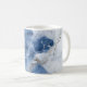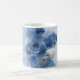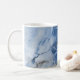A mug in dark blue, white and light blue marble liquid ink colours. The design is a dreamy romantic and elegant design with gold and silver traces like the coastal sea breeze shimmers. It looks like an abstract marmor stone texture and fluid lava at the same time. This design fits perfect in coastal homes and makes the breeze come into your room.