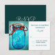 Blue Mason Jar Rustic Country Wedding RSVP Cards with a vibrant aqua blue mason jar with a burnt orange reddish bow on one side. The back of the RSVP reply card says "RSVP" on a solid aqua blue background.