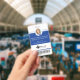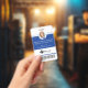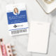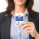 Professional and modern vertical circle photo blue identification badge. Customize with your photo, name, title, ID number, location name, logo and optional barcode. The design element can be changed to any color to suit your brand, simply click personalize and click to customize further. The reverse side features location/address.