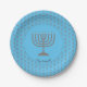 Elegant Sky Blue Menorah HANUKKAH Paper Plates, showing faux silver grey menorah in a tiled pattern. At the centre, there is an image of a large menorah which is CUSTOMIZABLE, so you can upload your own image. Underneath, the text reads CHAG SAMEACH. This is also customisable so you can add your greeting and/or name, etc (up to two lines). This is a minimalist, simple, elegant design, especially suitable for Hanukkah and other Jewish feasts. Comes in other colours, and matching items are available.