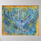 The original artwork for this menorah is a mixed-media painting created with acrylic paint, modelling paste, and paper by contemporary Jewish artist Meredith Gould.