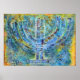 The original artwork for this menorah is a mixed-media painting created with acrylic paint, modelling paste, and paper by contemporary Jewish artist Meredith Gould.