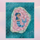 This design features a fun mermaid surrounded by a shell-like frame of pink and aqua. The background looks like teal-coloured fish scales. Mermaids are such fascinating beings, fictitious or mythical half-human sea creature with the head and body of a woman and the tail of a fish.