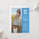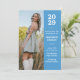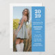 A simple modern graduation announcement in light blue features an eye-catching class year layout, photo of the graduate, their name, and school.