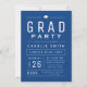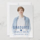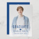 Modern and minimal typography graduation announcements with photo, fun graduation party invitation on the back in blue and white, Custom it with your own photo and party information.