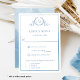 Elegant wedding RSVP card with a beautiful blue botanical monogram, with the ability to add meal choices, or, if you would rather have RSVP without meal options, simply erase meal instructions and choices from text boxes to delete or add in its place a personal message to your guests (i.e. "hope you can make it, can't wait to see you there!"). Monogram with initials in elegant calligraphy. Fine blue watercolor frame on the front, while back with a delicate watercolor wash in blue hues watercolor wash. Clean, minimal, and elegant style. Part of our "Blue Watercolor Botanical Monogram Wedding" Collection with a variety of coordinating products available. Visit the entire collection with this link: https://www.zazzle.com/collections/blue_watercolor_botanical_monogram_wedding-119923294821263262