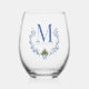 Blue Monogram Crest with Christmas Tree Stemless Wine Glass