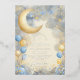 A dreamy watercolor design featuring a glowing crescent moon surrounded by hanging stars, fluffy clouds, and festive balloons in soft shades of blue and gold. Perfect for creating a magical and celestial-inspired baby shower atmosphere.