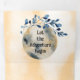 Watercolor flowers on a pale orange background with a blue moon and eucalyptus floral.