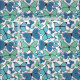 This fun vintage-inspired fabric features a pattern of blue morpho butterflies in a hand-drawn retro style in shades of bright blue, medium blue and light blue-green all tipped with black against a white background.