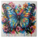 A hyperdetailed, ultra-quality closeup of a Blue Morpho Butterfly with vibrant, polychromatic wings, rendered in a vivid fusion of graffiti and splash art styles. Spray paint and melting oil gouache techniques create a high-contrast, street art aesthetic. Acrylic textures and CGSociety-level detail define the intricate floral nature elements surrounding the butterfly.