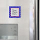 Replace the centre placeholder image on this blue and white polka dot photo frame magnet with your own digitally uploaded photo. The design will work on square or round magnets but the frame cutout will remain square.