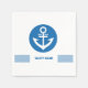 Celebrate on a yacht with this paper napkin design with a white boat anchor on a blue circle—custom yacht name with blue stripes.