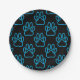 Blue Neon Dog Paw Print Pattern Paper Plate