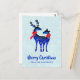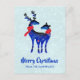 A holiday postcard which says Merry Christmas and a personalised message on the back. Designedwith a light green and white snowy looking background. Illustrated with a pair of blue scandinavian deer wearing red scarves. With decorative markings on their bodies.