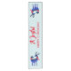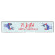 Table runner which says: A Joyful Merry Christmas. A light greenish blue background. Illustrated with a pair of blue scandinavian deer wearing red scarves. Decorative markings on their bodies.