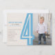 This fourth birthday party invitation features a giant number four in blue. The background is designed to look like kraft paper. Your little one's birthday party details are set to the left and their photo is displayed on the right. Photography © Storytree Studios, Stanford, CA