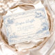 A classic powder-blue toile design inspired by traditional French countryside prints. Vintage nursery motifs — pram, rocking horse, lamb, pastoral village scenes and delicate ornamental borders — frame a clean, structured central layout. The soft ivory background paired with refined blue linework creates a timeless and sophisticated look. Perfect for a traditional baby shower with an elegant European aesthetic.