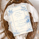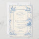A classic powder-blue toile design inspired by traditional French countryside prints. Vintage nursery motifs — pram, rocking horse, lamb, pastoral village scenes and delicate ornamental borders — frame a clean, structured central layout. The soft ivory background paired with refined blue linework creates a timeless and sophisticated look. Perfect for a traditional baby shower with an elegant European aesthetic.