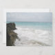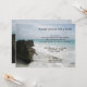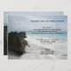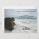 Generic party invitation. A cool scenic nature photograph of a shiny turquoise blue ocean scene with white foamy waves crashing against a craggy brown rock. Greyish blue cloudy skies.