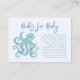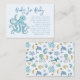 Cute under the sea theme baby shower book request card featuring illustration of a blue octopus. The card asks guests to bring in a new or used children's book instead of a card.