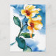 this flower watercolor has loosely deep yellow flowers with blue green leaves. With a wide watercolor brush stroke of blue to have the flowers stand out.