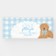 Celebrate your little one’s golden year with this adorable “One Golden Year” birthday banner! Featuring a sweet golden doodle puppy wearing a blue gingham bow, a scalloped white frame, and a soft blue checkered background, this personalized first birthday banner adds the perfect finishing touch to your celebration.