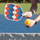 Personalised pickleball paddle. The argyle pattern has long been recognised as a classic design that has stood the test of time. The repeated diamond-shaped pattern evokes a sense of sophistication and elegance, adding a touch of refinement to pickleball attire and accessories. The symmetry and precision of the pattern also align with the sometimes meticulous angles and shots of the sport of pickleball. Additionally, the combination of bold and contrasting colours within the argyle design creates visual interest and makes a statement on the pickleball court. Overall, the argyle pattern as timeless charm, aesthetic appeal, and ability to add a touch of style and personality to any pickleball gear. Colourful Blue, Orange, and White pickleball-themed gift for your pickleball-loving mum, dad, uncle, aunt, brother, sister, neighbour, grandpa, grandma, husband, wife, friend, or work colleague who won't stop talking about pickleball.