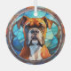 Here's a pretty glass ornament with a stained glass theme, featuring a beautiful Boxer dog. The dog is set against a predominantly blue abstract background with a brown orange border. This makes a nice stocking stuffer or decoration for the household who loves a Boxer.