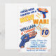 Nerf War 10th Birthday Invitation for boys. Gear up for an energetic celebration with this bold blue and orange theme. The layout displays a fun foam blaster battle motif, ideal for a massive tenth birthday bash. It features a large number ten inside a target, perfect for active kids who love team games. The style uses vibrant colors to create an exciting atmosphere. Customize the details for your specific time and location to ensure a memorable day for the whole squad.