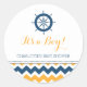 It's a boy baby shower nautical theme thank you favour tag sticker in elegant and fun dark navy blue, orange and white chevron zigzags pattern with ship's wheel. Customisable with your own text, contact us for a colour change. The perfect way to decorate your baby shower favours and thank your guests for being a part of your special day.