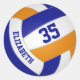These team colours volleyball round stickers for boys or girls feature a simple volleyball graphic with blue, orange and white panels upon which you can customise the player's name & jersey number in a varsity letter style font - by katz_d_zynes