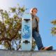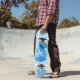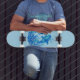decorative design of a blue coloured orca or killer whale jumping out of the water on a skateboard
