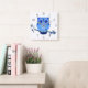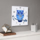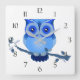 Clock with numbers has a blue monochromatic design of an owl on a branch with leaves.