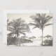 Palm trees custom birthday party invitation. For the gal celebrating a milestone birthday in a tropical location, this pretty card has script and printed fonts over a light blue beach background. Tall palm trees sway in the warm breeze and thatched top umbrellas line the sea coast. The reverse contains the same palm tree scene in sepia tone.