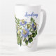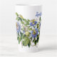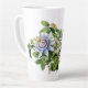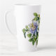 Passionflowers tall latte mug. White mug with place for her name in pretty periwinkle blue. The unique and exotic looking flowers are white with purple-blue centres and are surrounded by green leaves. The design wraps around the mug.