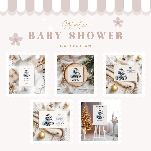 Celebrate a joyful winter baby shower with this charming design featuring a hand-painted penguin in a Santa hat and scarf, surrounded by stacked gift boxes and festive blue ornaments. The soft watercolor style and cool tones create a playful and cosy vibe—perfect for welcoming a baby boy during the holiday season.