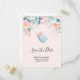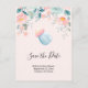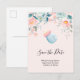 Save the date postcard with a cute image of a light blue baby bottle with a pink rim. A pink and green floral border adds a touch of elegance.